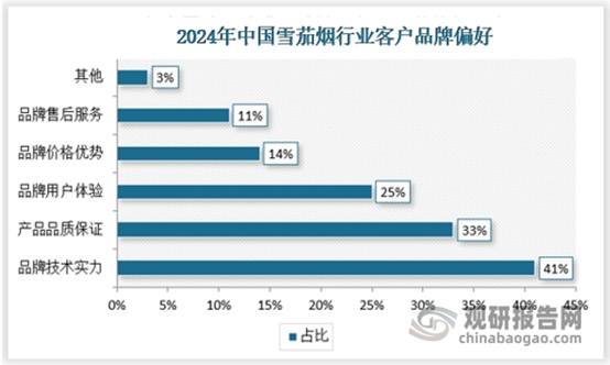 品牌偏好方面,根据调查,我国雪茄烟行业下游客户选择品牌时,主要考虑品牌的技术实力、产品的品质保证、品牌用户体验、品牌价格优势以及品牌的售后服务等因素。