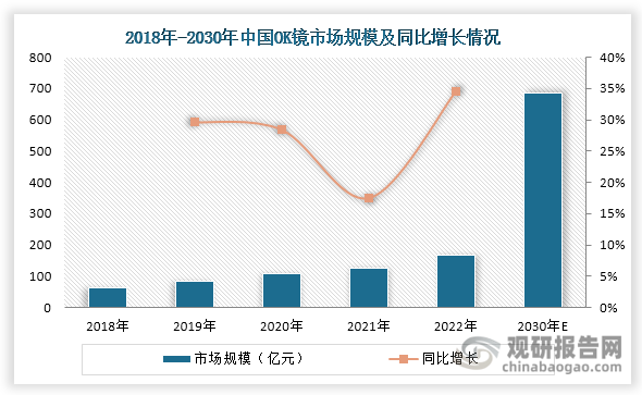 在近视防控需求旺盛及政策等因素推动下,近年来我国角膜塑形镜市场规模持续扩容,由2018年的64亿元上升至2022年的168.69亿元,年复合增长率达到21.39%,预计2030年市场规模接近700亿元。