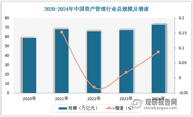 近年来,我国经济蓬勃发展,居民收入水平提高,资产管理需求随之增多。截至2023年末,中国资产管理行业总规模达67.06万亿元。截至2024年底,中国资产管理行业总规模已突破70万亿元。